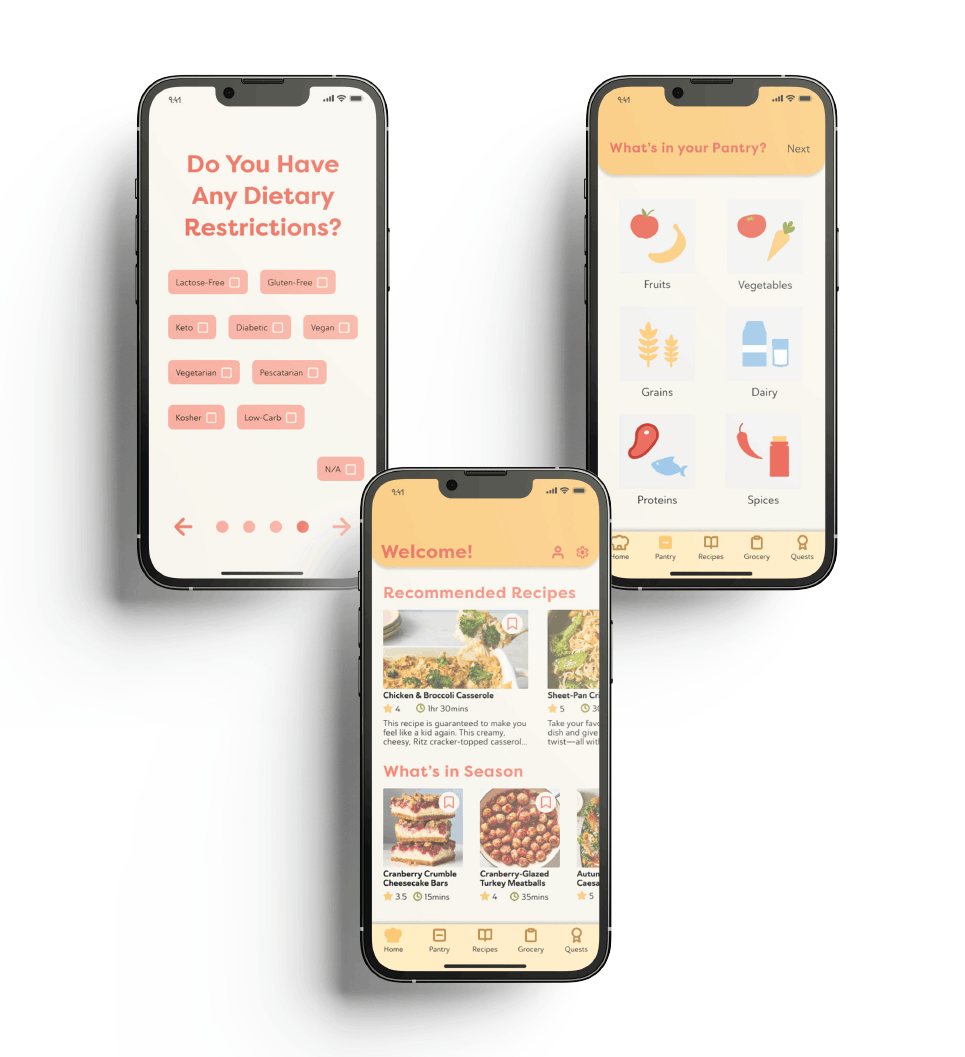 Home Pantry is an app that helps motivate and ease remote workers into cooking at home. The app includes features that helps generate recipes with the ingredients they already have at home and an onboarding that takes dietary restrictions and allergies into consideration prior to generating recipes. The app also includes fun in-app achievements inspiring the user to try out new and easy-to-follow recipes.