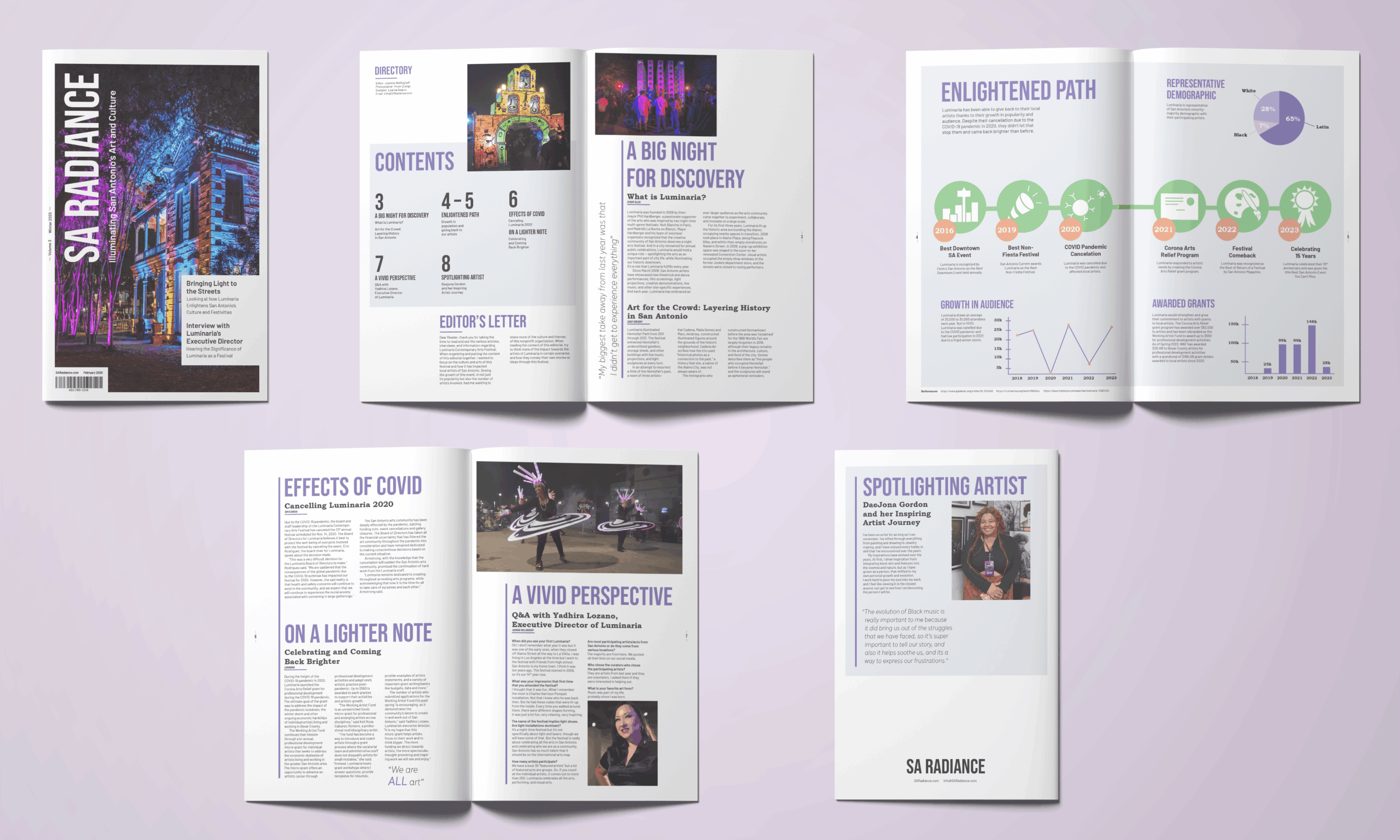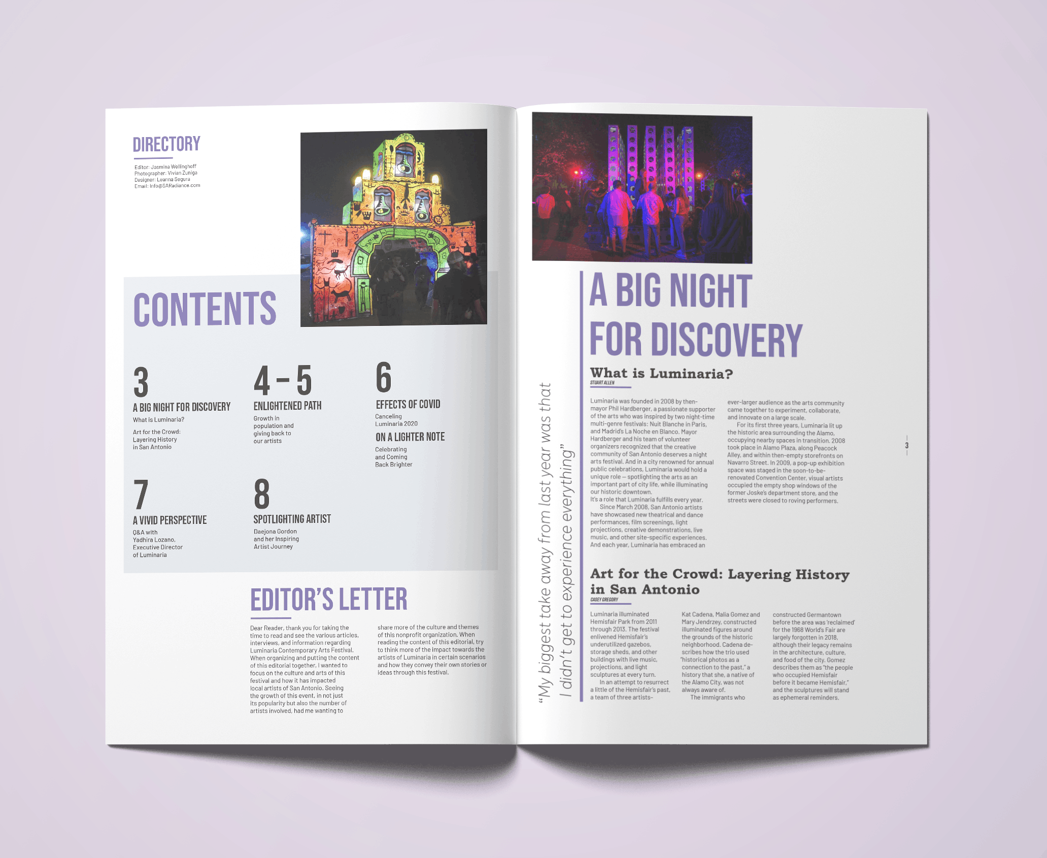 This newsletter highlights Luminaria, a night event where local artists of San Antonio come together to display their art throughout the downtown area. This newsletter uses a consistent layout to help separate the articles and art featured.